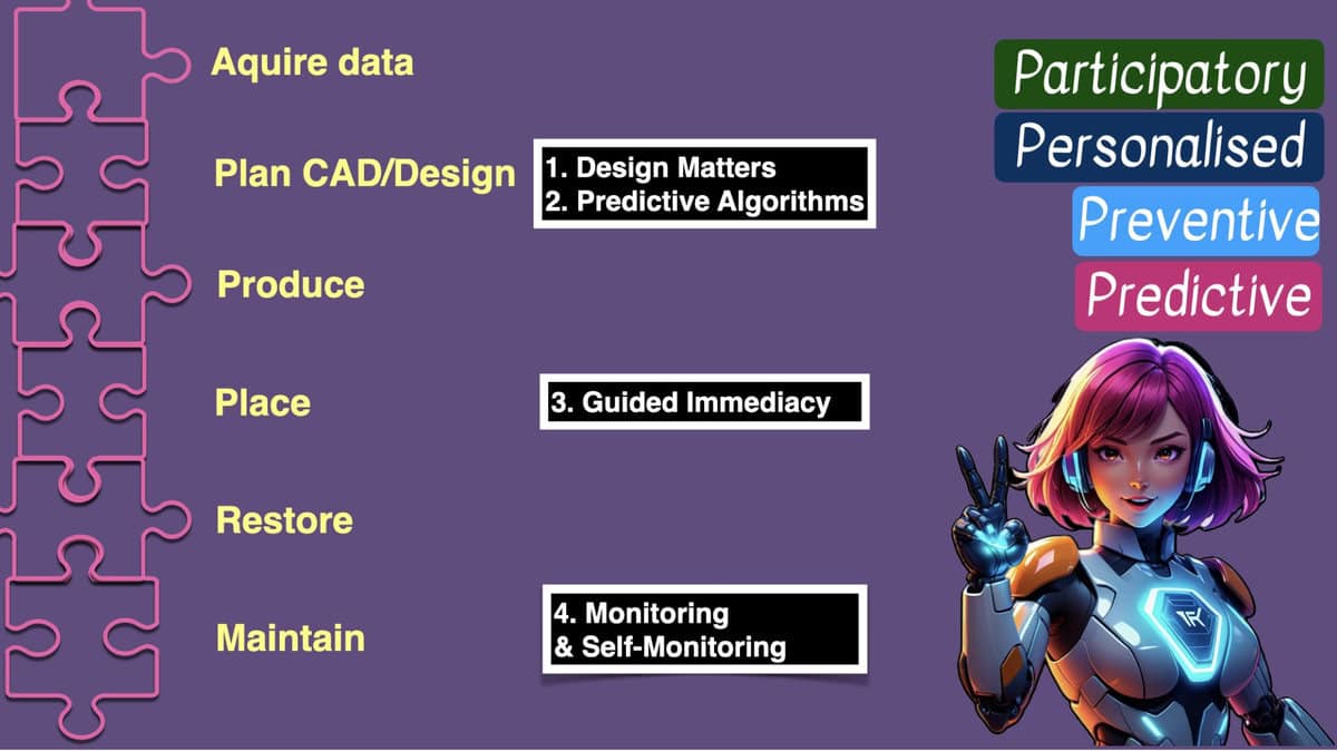 Precision Medicine or P4 is a paradigm of care which considers a patient’s individual characteristics to guide diagnosis and treatment. With the wide implementation of a digital workflow, implant dentistry is not fit for P4 practice focused on personalised care, preventive design, predictive algorithms and participatory engagement of the patient.