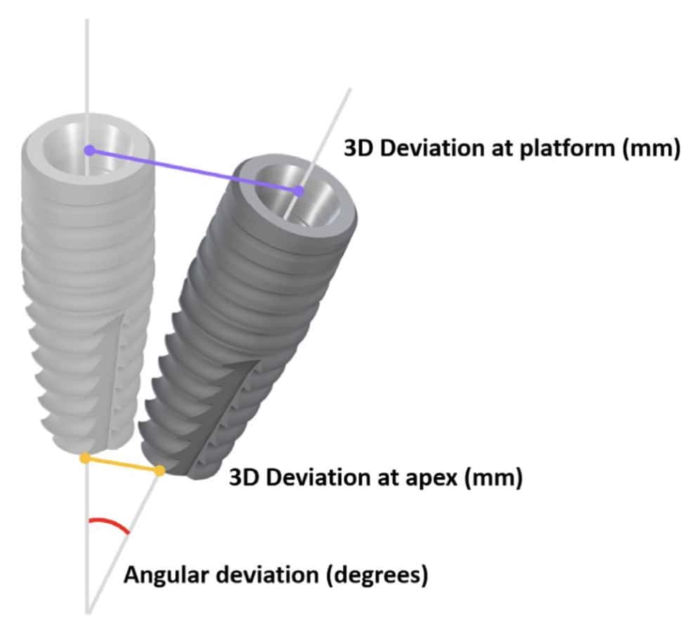 Typical parametres measured to assess accuracy of implant placement: 3D deviation at platform and apex and angular deviation.