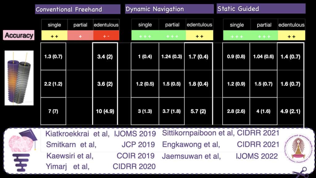 Back the main point now: how accurate is implant placement when we use CAIS? To answer this allow me to discuss the results we have accumulated through a major CAIS research project in our clinic at Chulalongkorn University in the past 3 years (3,6-11). This project has by now involved more than 200 patients and included research protocols in many different clinical scenaria. The strength of this project is that it allows us to shape a comprehensive view of the effectiveness of CAIS, while limiting as much as possible the variation of the workflow error. A typical systematic review will compile numbers from many published studies, e.g. 2 studies from centre A on single gaps and 1 study from centres B and C each on fully edentulous patients. It would be very difficult to draw any valid conclusions on the accuracy of CAIS in single gaps as opposed to fully edentulous, because the 3 studies essentially report the results of 3 different workflows.  The three centres use a different CBCT machine, a different planning software and in the case of static CAIS they might be using different printers and guided surgery implant systems. With all these different parametres contributing differently to the potential errors, it is impossible to conclude what is the impact of the clinical condition (single gap vs fully edentulous) in the finally reported accuracy numbers.
