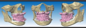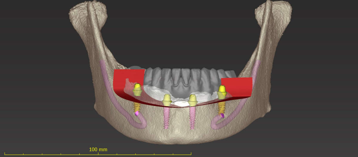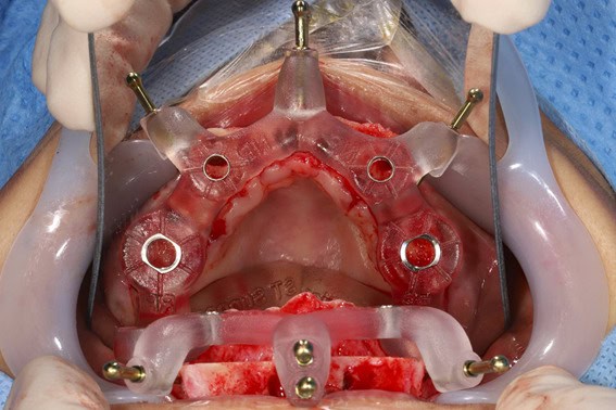Horizontal ostectomy is conducted, guided by the surgical template and then guided implant placement follows, with the immediate monolithic prosthesis placed at the end. Accuracy on every step is essential, or the cumulative error can derail the process.