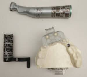 The dynamic CAIS systems are based on a principle which reminds the GPS navigation. In the first generation systems, a set of stereoscopic cameras was constantly recording the position of a set of trackers (called fiducial markers) on the patient and the surgeons handpiece. The software then calculated the exact location of the patient and the handpiece in space and projected the drills on the actual patient’s CBCT in real time, through a screen (Figure 3). Of course, this only made sense if the software could maintain at all times a proper spatial alignment of the patient and the drills. To achieve this, the patient had to wear a custom-made split during the CBCT and during surgery, but also sensitive registration and calibration procedures were required before the surgery. The first and second generation of dynamic systems utilised  many components and required rather big areas of fiducial markers (Figure 3).  Like in static CAIS also here, there is not a uniform technology and many companies have developed different systems. In this way, there has been systems with 2, 3 or 4 tracking cameras, different size and design of fiducial markers and calibration procedures, as well as different planning and visualization software. There is very little reported in research with regards to comparisons on different dynamic CAIS systems, so one can only try to assess systems performance based on their reported specifications.