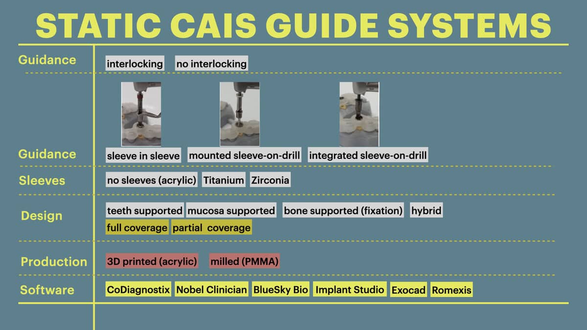 The CAIS tree started initially with two main approaches, the “static” or “guided” and the “dynamic” or “real time navigation”. As with everything new, the terminology is a bit confusing at times, in particular in studies comparing CAIS with conventional placement. So in some studies you will see the conventional placement to be reported as “freehand”, but that will be misleading as the placement with real time navigation is also “freehand”. In other studies the conventional placement was referred to as “mental” guided, but that is misleading too, as mental capacity should be behind any kind of placement. On top of that, with the meaning of “mental” in colloquial American English and with the mental pressure we have all been subjected to under the years of Covid-19, this term is not particularly attractive. So, to streamline our terms a bit, CAIS implies the use of digital aids or products during the surgical implant placement. It can be static, where the surgeon places the implant in a pre-determined position by means of a surgical guide, or it can be dynamic, (which is actually freehand), where the surgeon places the implant by means of real time projection of the osteotomy on a screen, in relation to a pre-identified position. These two technological principles have now evolved and diversified so much, that we can describe a whole “technology tree” with many branches already.