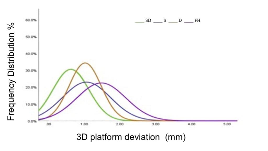 Observe with the green curve the frequency distribution of the deviation at platform for the combined static and dynamic surgery. Having most of the observations left of all other curves also implies that in more than half of the  cases the accuracy achieved was below the threshold of 0.8 mm. Interestingly, although static (blue) and dynamic (brown) alone have similar average, the dynamic appears less spread, possibly indicating  more cases within a set of acceptable deviation.