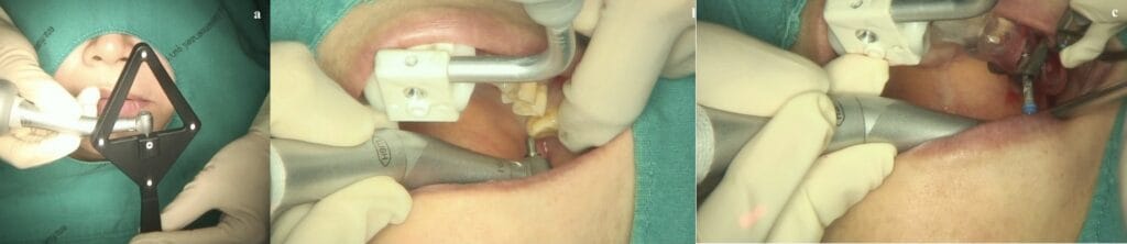 The use of the combined techniques is relatively simple if one has experience with both. At the left: the registration of the handpiece. Middle: registration of the drill tip and right: drilling with the surgical guide in place (right) and the splint with the fiducial markers of  the dynamic navigation system (left).
