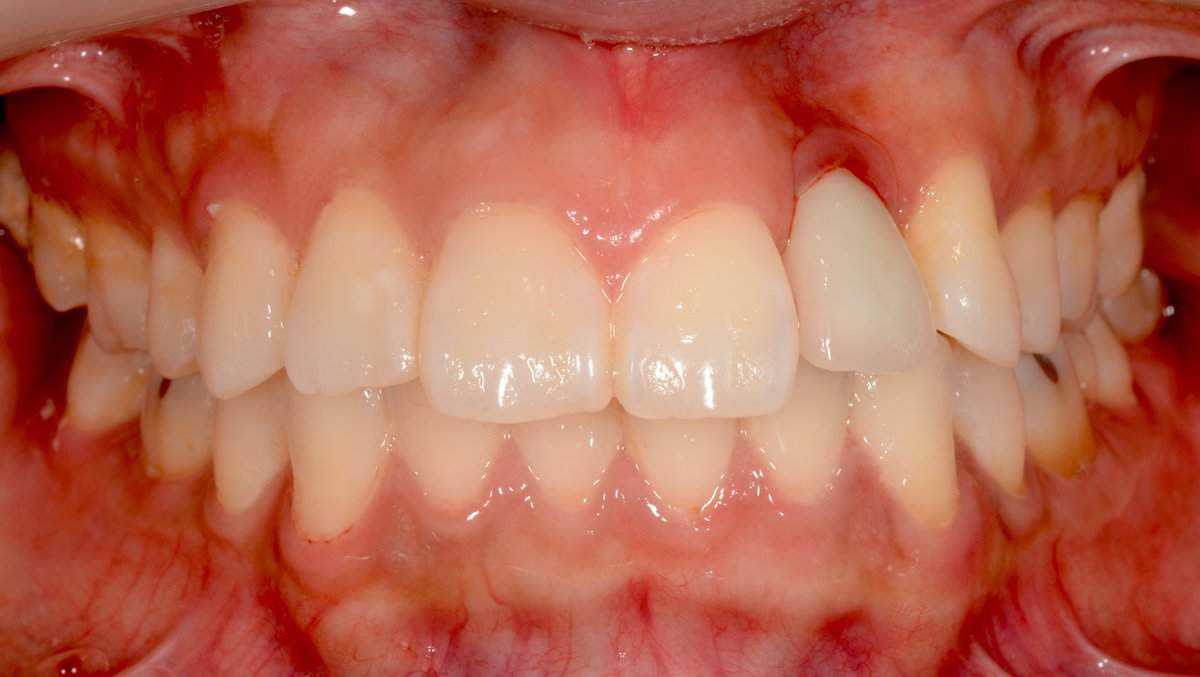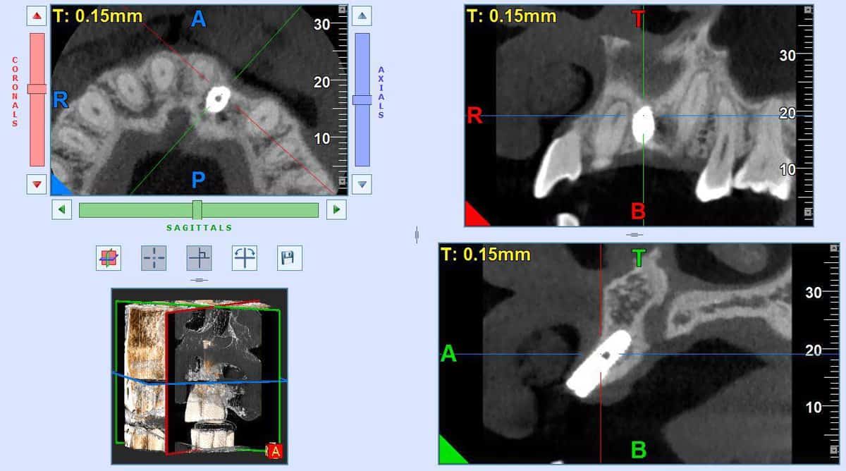 Established Mucositis and swelling buccal of the 22, initially attributed to absence of keratinised mucosa and thus referred for soft tissue augmentation. Studying the CBCT however, in combination with the clinical examination, one can see the main problem here to be the implant position. In particular the bucco-palatal angle results in the implant shoulder  being too buccal. As a result the cement retained prosthesis is also protruding in its apical part, resulting to recession beyond the mucogingival line. Unless we can correct the implant position and the crown, any intervention targeting the soft tissues alone is likely to make the problem even worse.