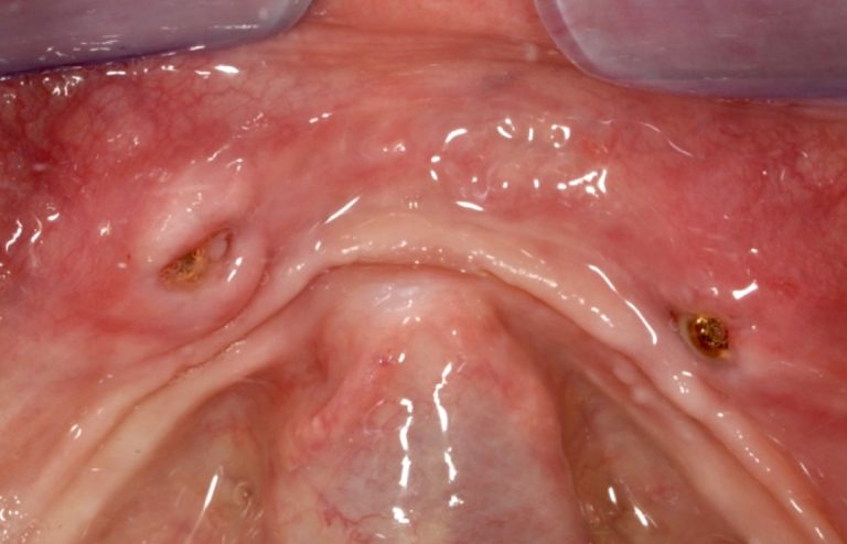 Locator abutments of mandibular overdenture, burried under the swollen and inflamed oral mucosa. Resolution of the inflammation in such cases is very challenging, but unless some surgical adjustment of the peri-implant tissues takes place the problem can be recurrent.