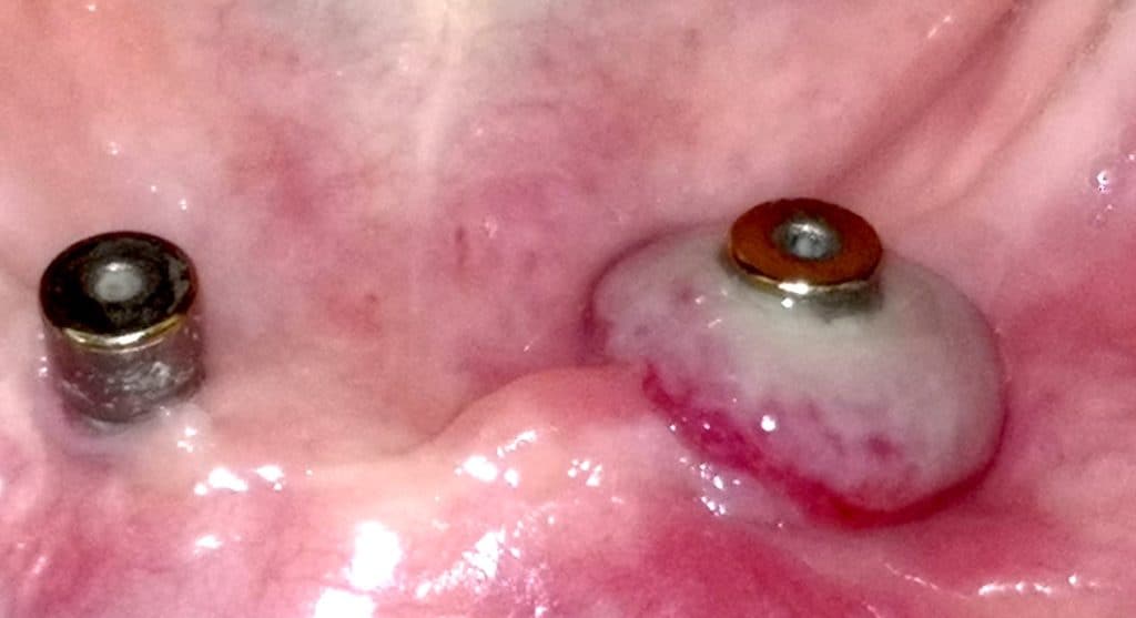 Baloon-style swelling of the tissues around locator abutment of mandibular overdenture, combined with Peri-implantitis. Adjustment of the soft tissues in combination with teh peri-implantitis surgery is essential in such cases to minimise the risk of recurrence.