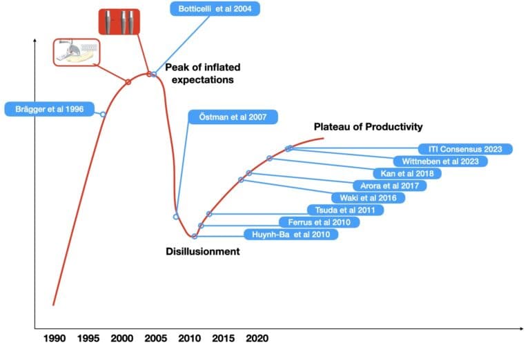 As confidence with immediacy increased, so did the observations of “tissue stability” and “bone stability” multiplied.  Steadily, immediacy started to be suggested as the way to counter “atrophy and bone resorption” of the alveolar ridge. Today it might be difficult to understand how this suggestion spiralled into a wider perception through several cycles of self-reinforcement. One has to think that in the early 00’s  implant dentistry was still just an outlier practice. The volume of implants placed was a fraction of today’s and the assessment of outcomes mainly dominated by osseointegration and survival. Implant practice was limited to few clinicians, while research was lead by a handful of university centres. Also, the research methodology was limited by the technological means and the knowledge of the time. Assessment of bone margin was limited to what one could see in often poor quality peri-apical radiographs, tissue health was only superficially defined and understood, while peri-implantitis was for many non-existent. With the documented cases of immediacy being limited to the hands of few very experienced clinicians in high profile university clinics and on selected patients, adding a bit of a novelty effect, imprecise technology and tools and there you can see, it does not take much to overestimate the technique, stretch success too thin and stumble.